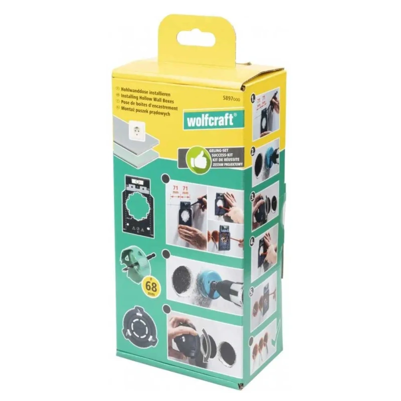 Piktogrammid juhendavad šablooni otstarbekat kasutust ja teevad paigaldamise turvaliseks ja lihtsaks. - 1 süsinikterasest augusaag, läbimõõt 68mm, puurimissügavus 30mm, pehmetele puidusortidele ja ehitusplaatidele. Komplektis kuuskantsaba ja 6mm tsentripuur.