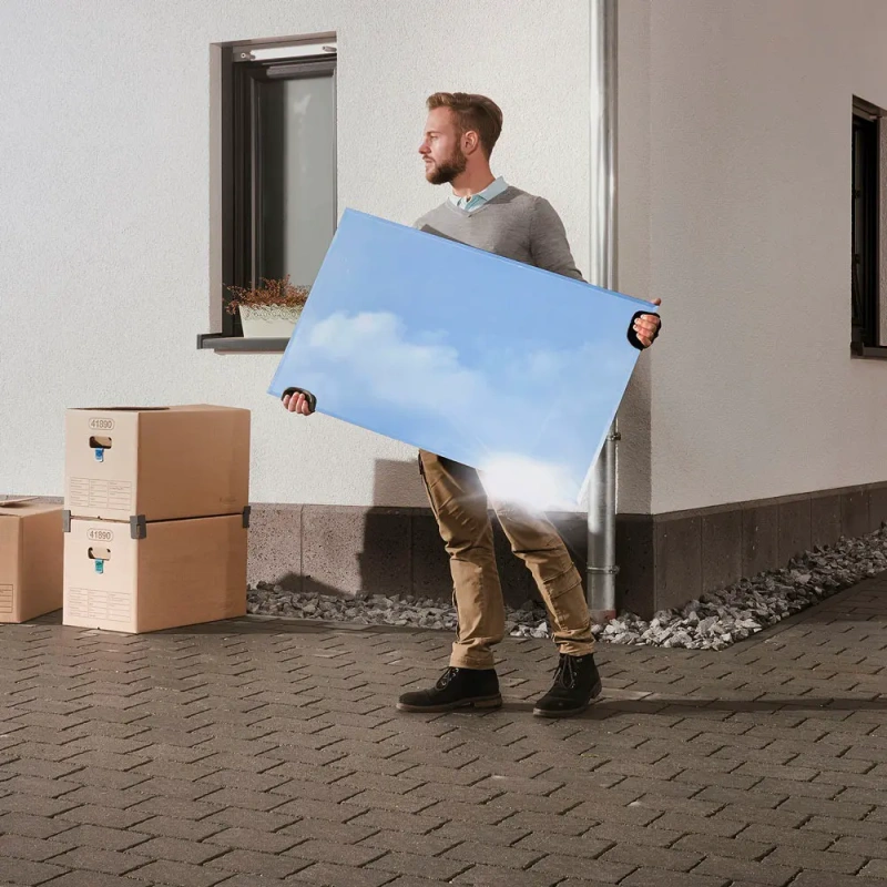 Kõrgekvaliteedilised neopreenist käekaitsed pakuvad optimaalset koormuse jaotust kõvade ja teravate servadega esemete kandmisel. Need kaitsevad usaldusväärselt verevalumite ja nahavigastuste tekkimise eest kätele ja randmetele. Ergonoomilist disaini saab paindlikult kohandada takjakinnituse ja täiendava elastse rihmaga vastavalt käe suurusele. Vabad pöidlad annavad täieliku kontrolli haardel, mistõttu sobivad käekaitsed hästi õrnade esemete, näiteks klaasplaatide või peeglite kandmiseks. Käepadjad saab lihtsalt alla keerata, kui on vaja käed kiiresti vabastada.