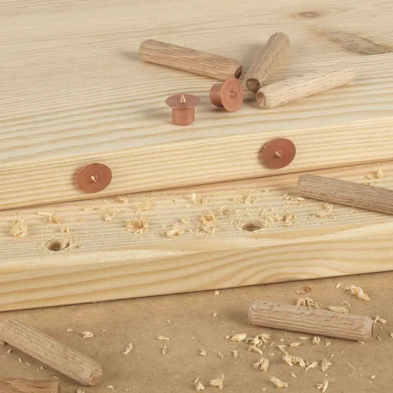 Need nutikad abivahendid on kuluefektiivne lahendus puidust tüübliühenduste vastupidiste puurimiskohtade märgistamiseks. Komplektis on neli tugevast terasest valmistatud märkenõela. Neil on 6mm vars, mille sisestate oma detaili ette puuritud tüübliaukudesse nii et nõelaots jääb väljapoole - see võimaldab teil märkida õiged puurimiskohad täiendavale detailile. Teete seda, lükates detailid tihedalt kokku ja joondades need õigesti. Kui surute plaadid kokku, suruvad nõelad vastaspoole detaili ja märgistavad sobiva tüübli augu õige puurimiskoha.
