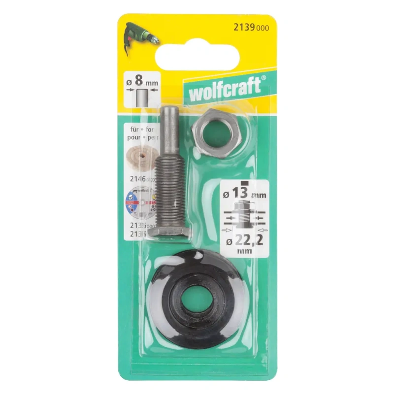 13 mm ja 22,2 mm avaga hoidik tagab, et ilma varreta kinnitatud lihv- ja poleerimisketas on korralikult tsentreeritud ja jookseb optimaalselt ühtlaselt. Võllil on ümar vars, mis võimaldab selle kiirelt puuri padrunisse lukustada, on ühilduv riidest kettaga (art. nr 2146000).