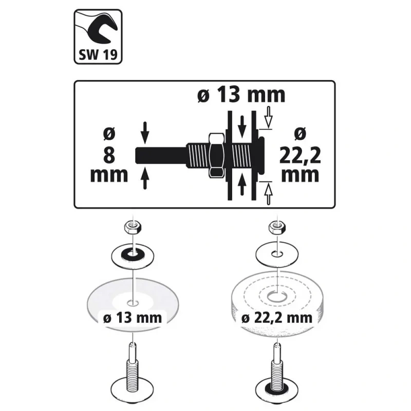 - 13 mm ja 22,2 mm avaga hoidik võimaldab varreta lihv- ja poleerimisketastel optimaalselt ühtlaselt töötada