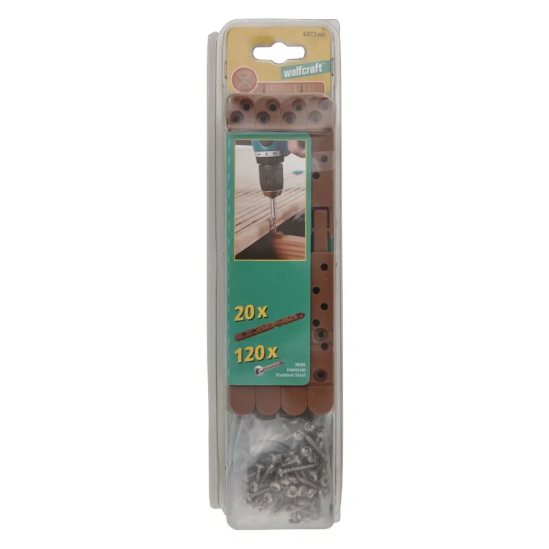 Peidetud kinnitussüsteemi ühendustarvikud terrassi paigaldamiseks. See tähendab, et puuduvad murdunud kruvid või pragunenud terrassilauad. Ühendustarvikud loovad terrassilaua ja alusprusside vahele piisava vahemaa, mis kaitseb veeloikude tekke eest, tagab optimaalse ventilatsiooni ja tagab teie puitterrassi katkematu kasutamise aastateks. See komplekt on ideaalne kaaslane peidetud kinnitussüsteemi algkomplektile (art. nr 6971000). Võite olla kindel, et tulemus vastab kõige kõrgematele standarditele.
