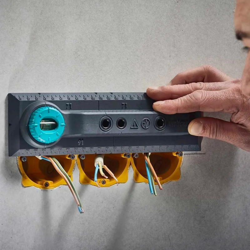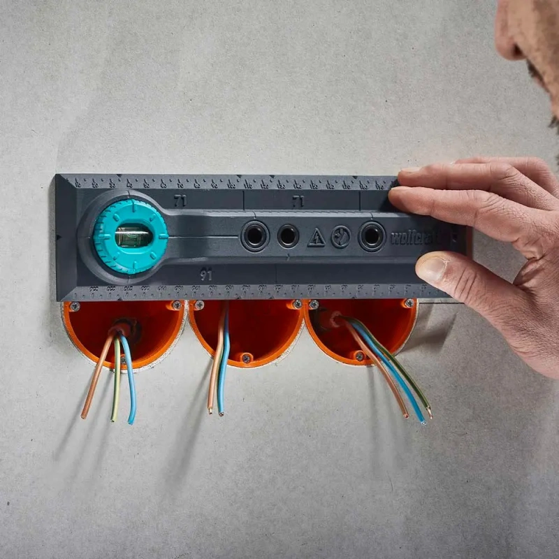 Integreeritud millimeetriskaala abil saab kiiresti ja täpselt määrata õige paigalduskauguse hoone servast. Puurimisrakisel "Electrics" on kõigil külgedel 71 mm märgistused, mis lihtsustavad kahe paigalduskasti vahekauguse täpset kopeerimist. Samuti on märgistused 91 mm kaugustele, mis on vajalikud pistikupesade ja TV/võrgupesade vahel.