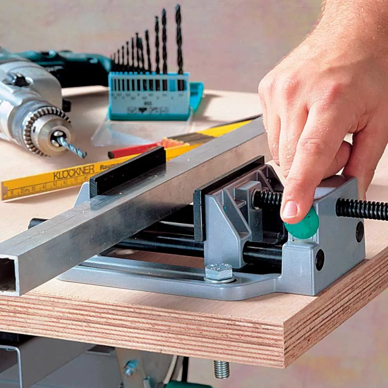 Alusele fikseeritavad alumiiniumvalust kruustangid, mille V-kujuliste terasest lõugadega saab fikseerida ka ümaraid materjale.