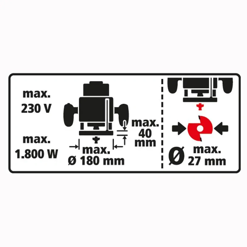 - ülafreesidega max. 230 V / max. 1,800 W, aluspinnaga läbimõõduga max. 180 mm, aluspinna kõrgusega max. 40 mm ja freesitera läbimõõduga max. 27 mm