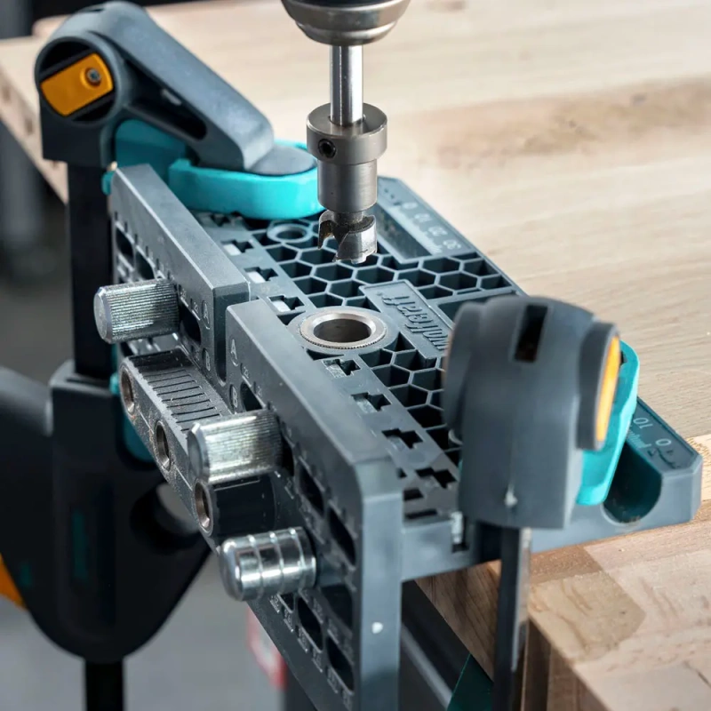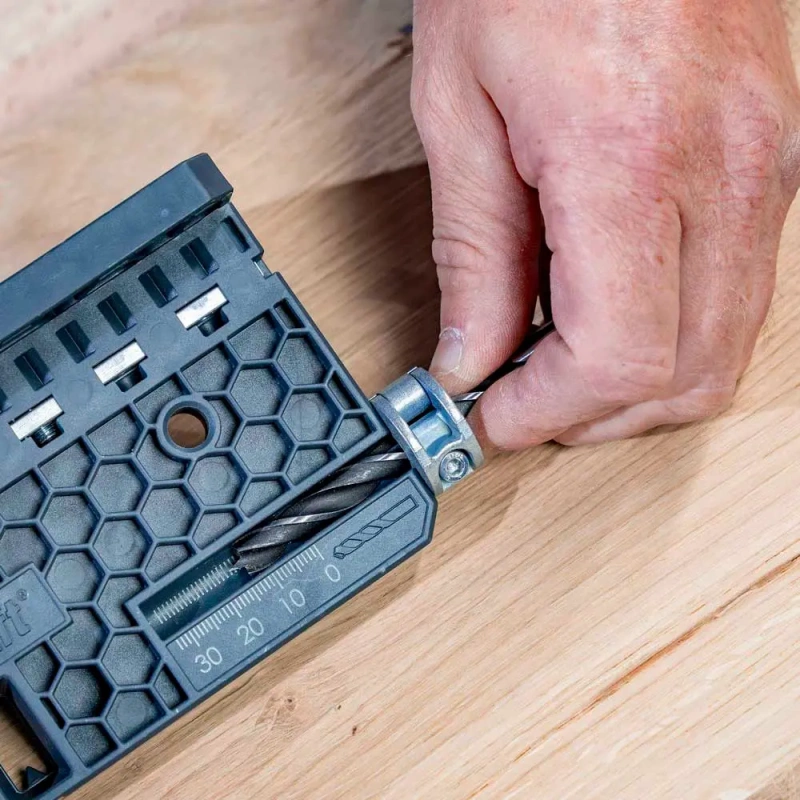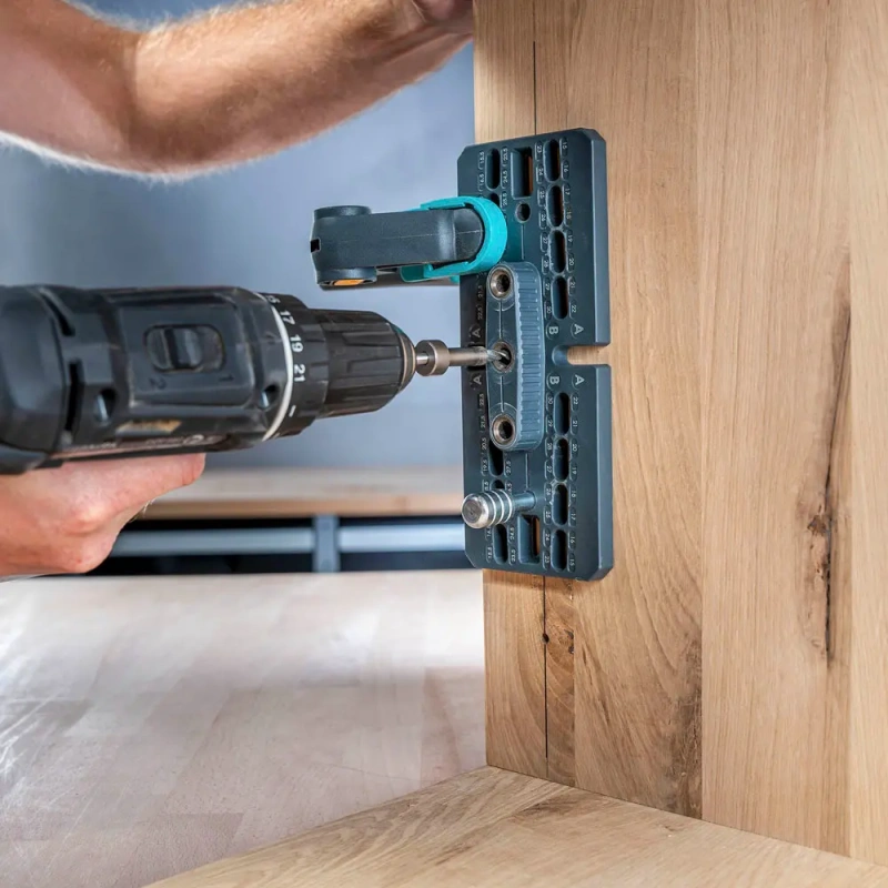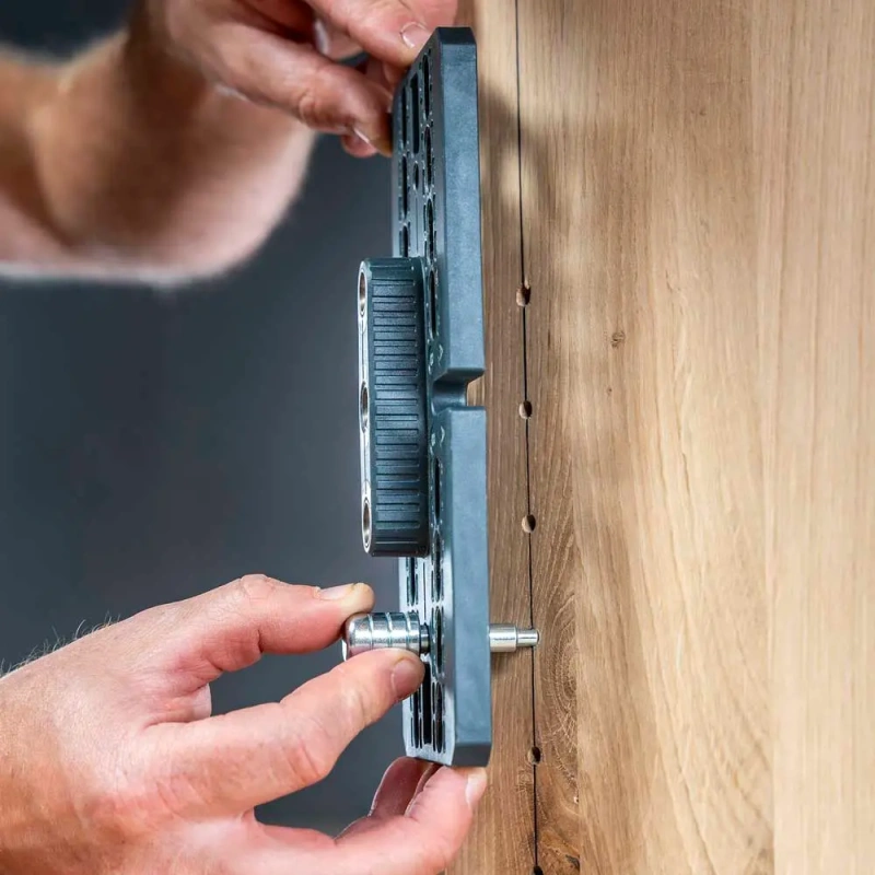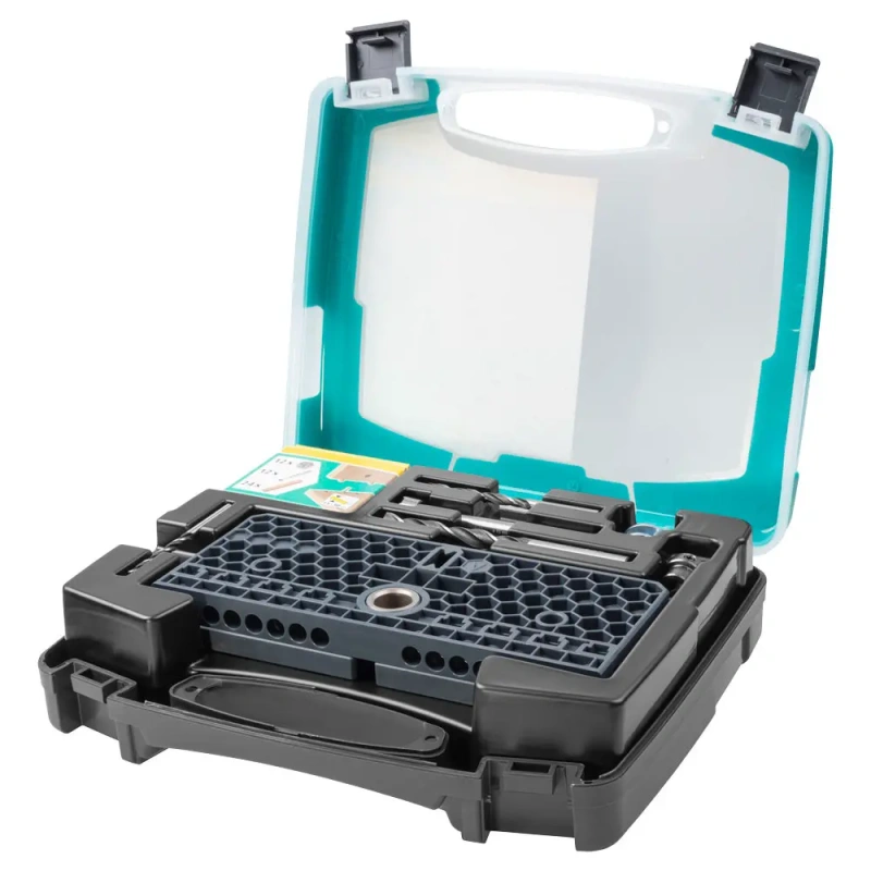 Komplekt sisaldab ka kaheastmelist puurišablooni, mis võimaldab täpset puurimist ja õige puurisügavuse määramist. Šabloon on varustatud 32 mm standardmustriga, mis võimaldab teha auke reguleeritavate riiulite jaoks. Juhend ja videoõpetus aitavad igat sammu selgelt järgida. Kogu komplekt on paigutatud praktilisse plastkohvrisse.