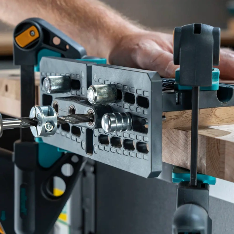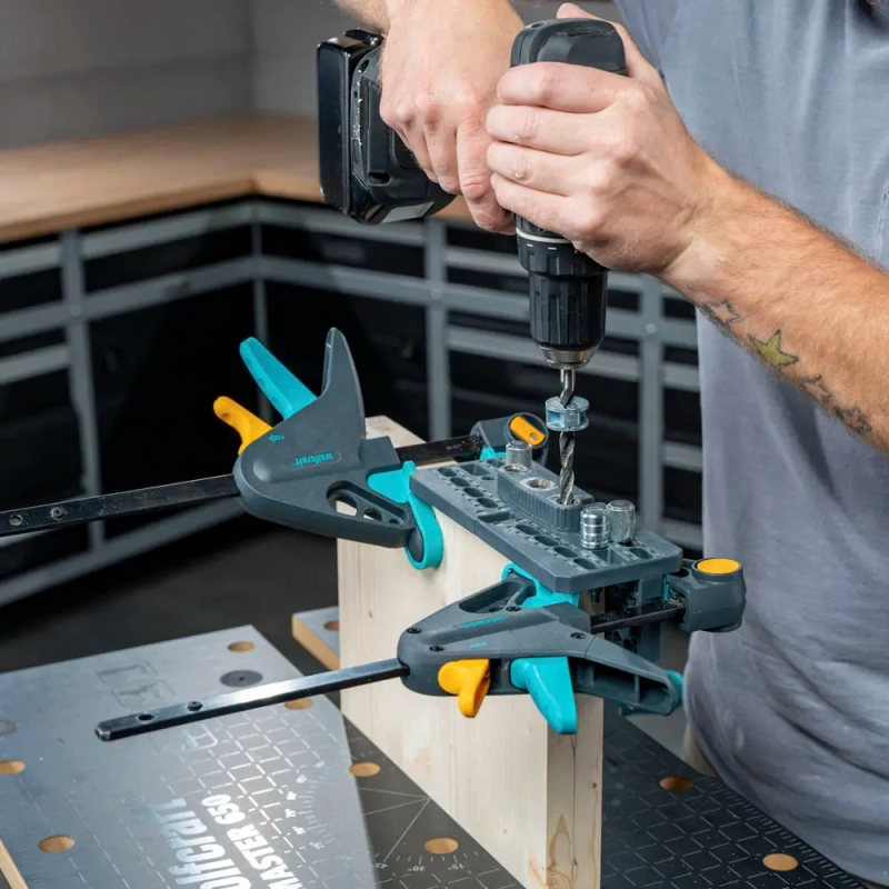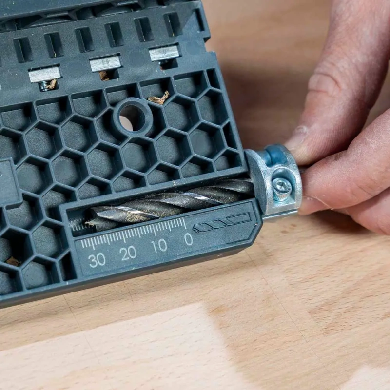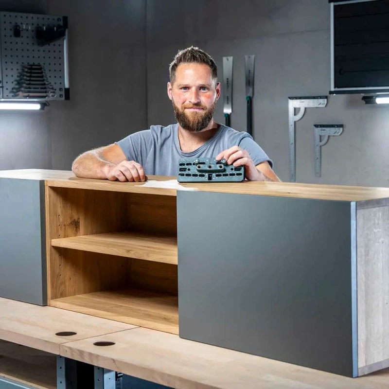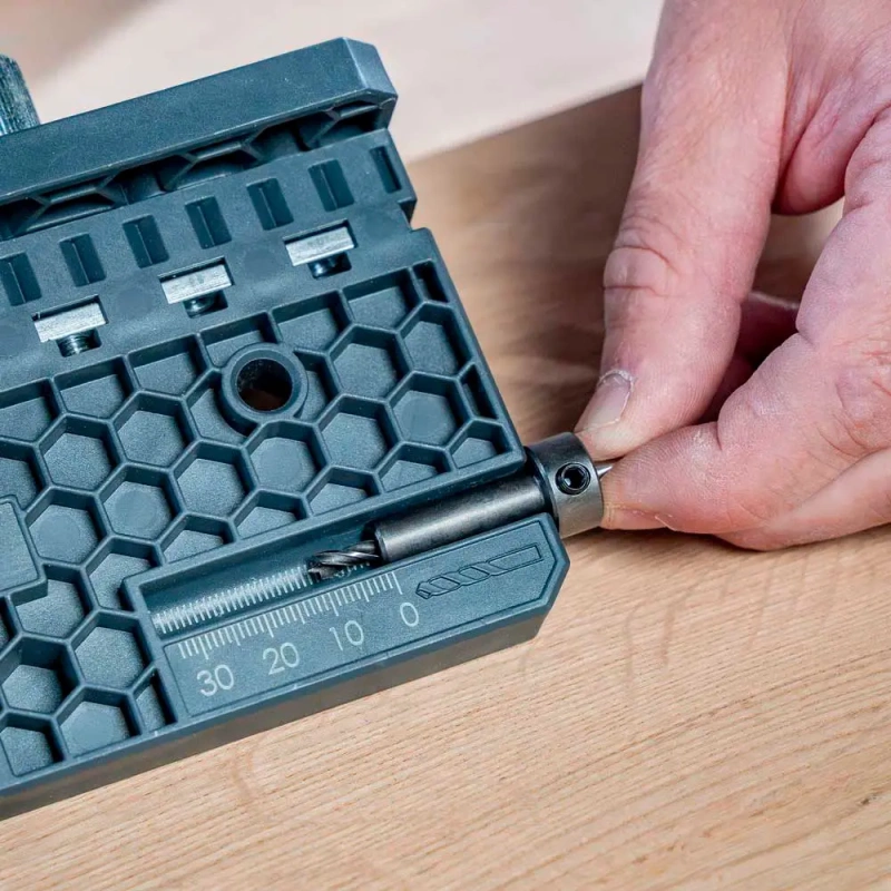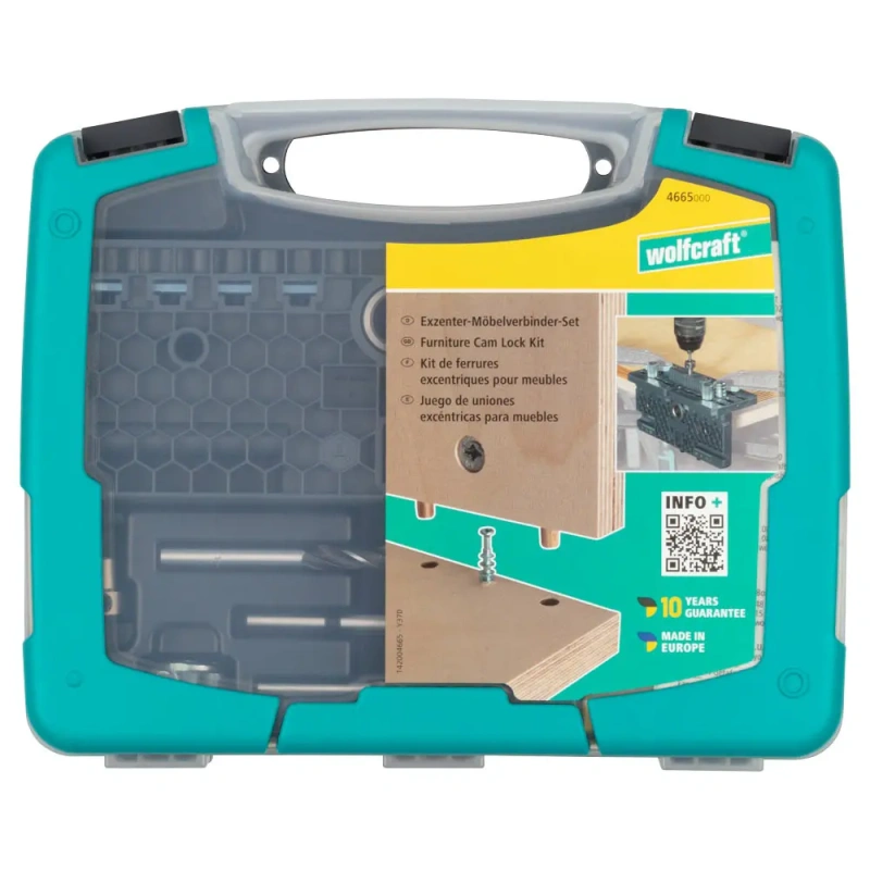 Komplekt sisaldab ka kaheastmelist puurišablooni, mis võimaldab täpset puurimist ja õige puurisügavuse määramist. Šabloon on varustatud 32 mm standardmustriga, mis võimaldab teha auke reguleeritavate riiulite jaoks. Juhend ja videoõpetus aitavad igat sammu selgelt järgida. Kogu komplekt on paigutatud praktilisse plastkohvrisse.