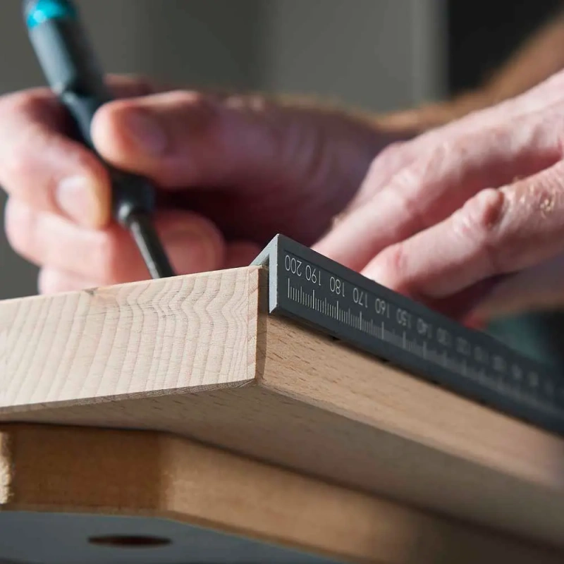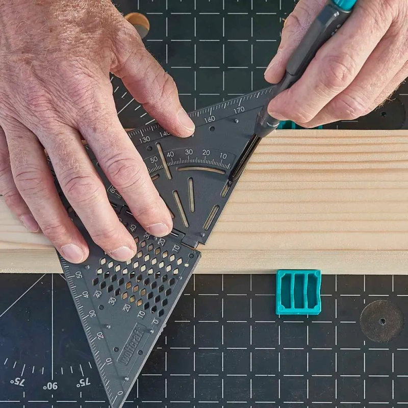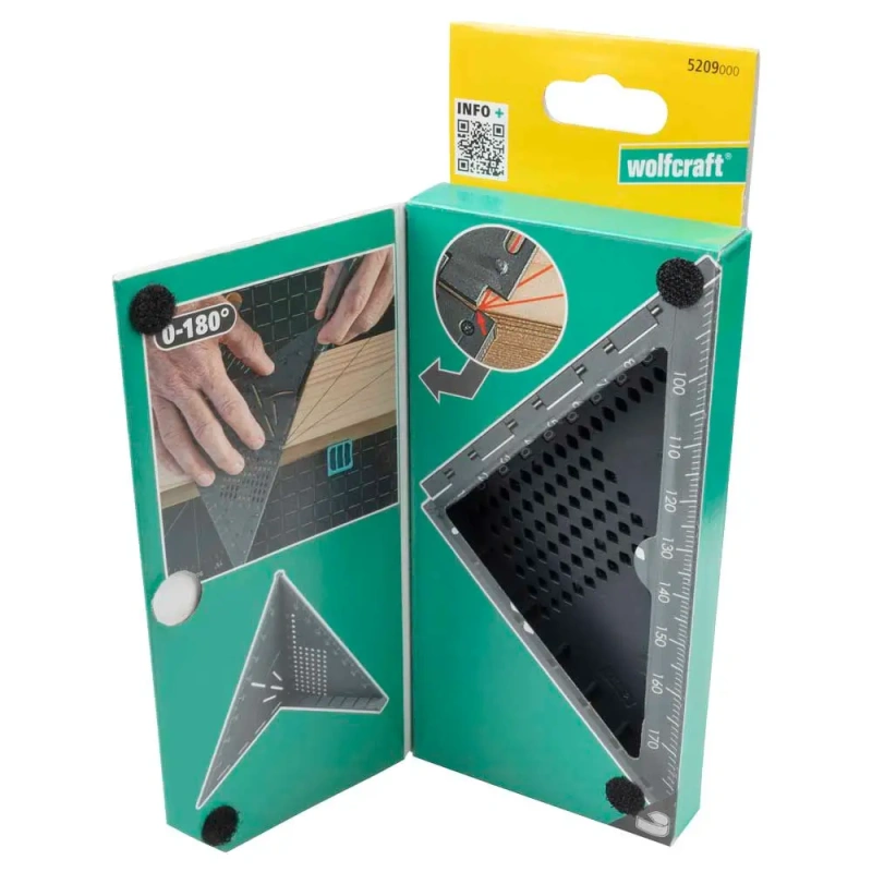 - märgistused 45° ja 90° nurkade jaoks ning skaala mis tahes nurga jaoks 0° kuni 180°, kontrollitud joondamiseks ja märgistamiseks
