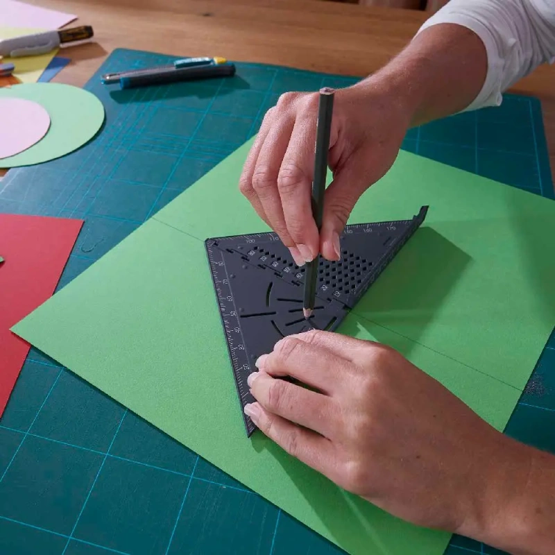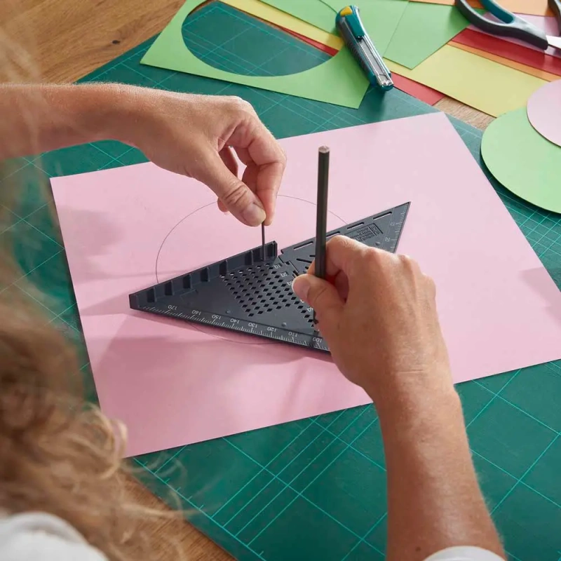Millimeeterskaala, 45° ja 90° nurk ning skaala mis tahes nurga jaoks 0° kuni 180° võimaldavad täpset joondamist ja täpseid märgistusi. Lisaks saab mõõte- ja märkimisnurka kasutada märkimisjoonlauana täiuslike paralleelsete joonte märkimiseks. Sirkli funktsiooni abil saate sekunditega joonistada kuni 80 mm raadiusega ringe.