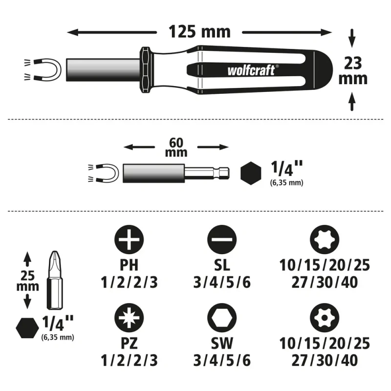 - sisaldab 4 Solid otsikut, 25 mm, lamedate kruvide jaoks (0,6 x 4 mm / 0,8 x 5 mm / 1 x 3 mm / 1 x 6 mm)