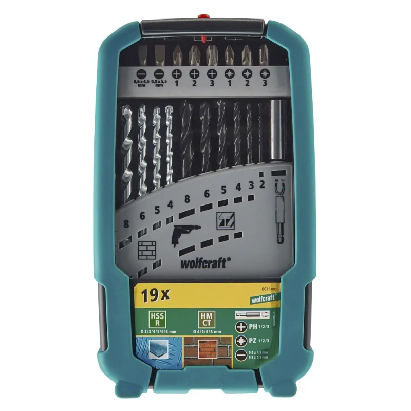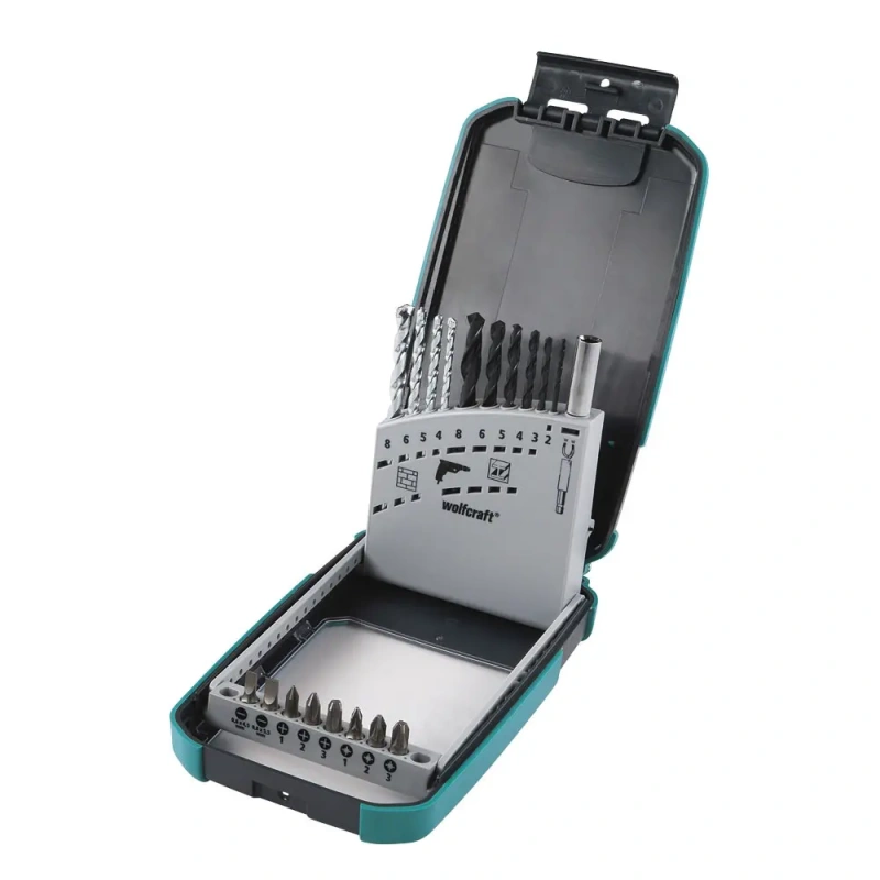 See puuride- ja kruvimisotsakute komplekt on mitmekülgne komplekt erinevateks puurimis- ja kruvimistöödeks. Komplekt sisaldab 6 terasest metallpuuri, valtsitud, Ø 2/3/4/5/6/8 mm; 4 volframkarbiidotsaga kivipuuri, Ø 4/5/6/8 mm; 3 Solid-kruvikeeraja otsakut (PH 1/2/3); 3 Solid-kruvikeeraja otsakut (PZ 1/2/3); 2 Solid-kruvikeeraja otsikut ( lapik 0,6 x 4,5 mm/0,8 x 5,5 mm). Sisaldab magnetiga otsakuhoidjat ja kvaliteetset plastkarpi ohutuks transportimiseks ja korrastatud hoiustamiseks.