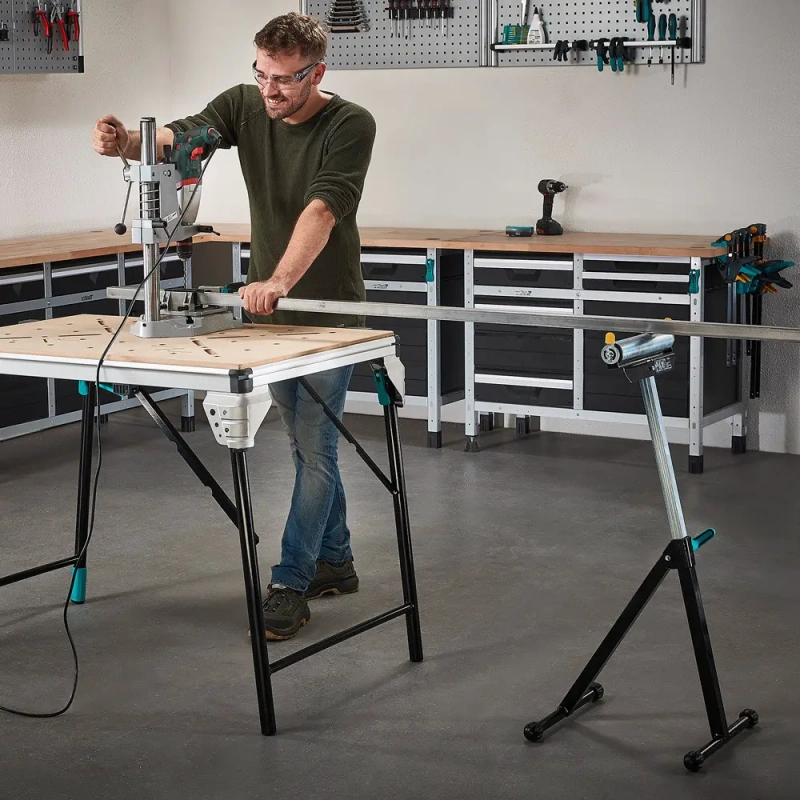 Reguleeritava kõrgusega kokkupandav rull-laagriga toestuspukk on ideaalne viis oma saepingi või tööpingi pikendamiseks. Laagritega varustatud 300 mm laiune toetuspind võimaldab töödetailide sujuvat ja lihtsat juhtimist soovitud töötlemissuunas. See võimaldab pikkade töödetailide kontrollitud ja mugavat saagimist ja freesimist. Pidev kõrguse reguleerimine võimaldab kohandada rullalusega toestuspukki kõikide kaubanduslikult kättesaadavate masinalaudade ja tööpinkidega. Kui töö on lõpetatud, saate rullalusega tugialuse sekunditega kokku panna ja ruumisäästlikult hoiustada.