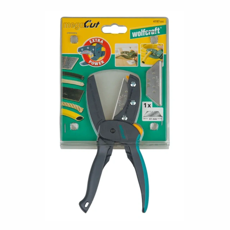 Selle universaalse lõikuri ülimalt terav ja suure jõudlusega roostevabast terasest tera võimaldab hõlpsalt lõigata läbi tugevate materjalide, nagu torud, kaablid ja isegi kuni 13 mm paksuse naha. MegaCut ergonoomilise, libisemiskindla käepidemega sobitub mugavalt kätte. Terahoidja esiosas olev vedruga varustatud turvakate hoiab ära juhusliku kontakti tera tipuga. See kaitseb ka integreeritud lukustusmehhanismi, et vältida vigastusi. Komplektis on üks varutera.