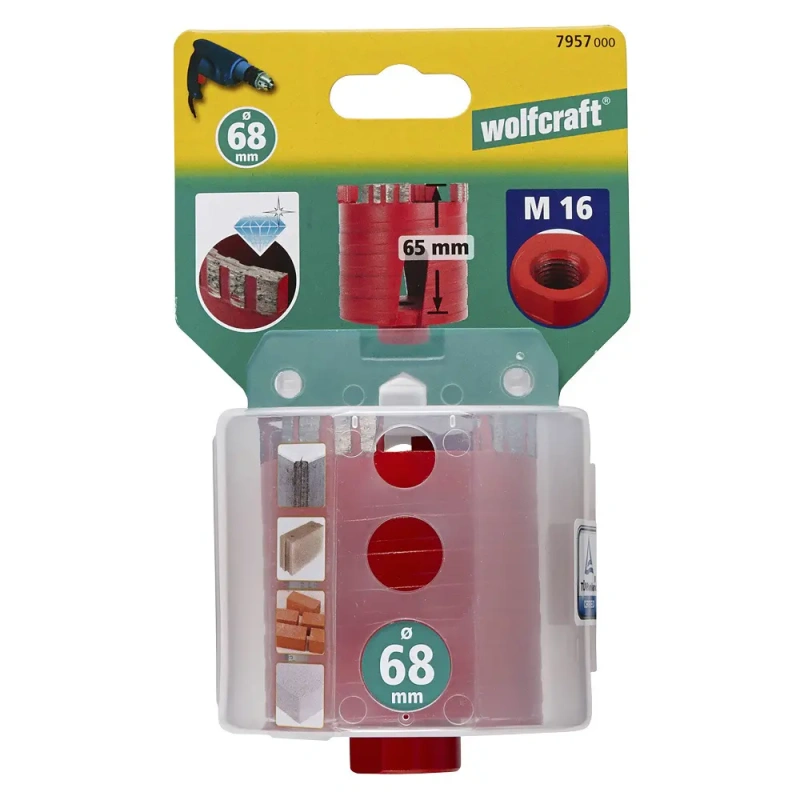 Teemantotsaga augufrees sobib ideaalselt aukude kiireks puurimiseks betooni, tellisseintesse ja kividesse (nt betoonplaadid, äärekivid ja muud sarnased kõvad kivid). Selle vastupidav disain muudab selle äärmiselt vastupidavaks. Maksimaalne lõikesügavus 65 mm ja erinevad läbimõõduvalikud teevad sellest augufreesist ideaalse tööriista süvistatavate pistikupesade (jaotuskastide ja pistikupesade) paigaldamiseks. Väliskruvi võimaldab puuritolmu usaldusväärset eemaldamist ja hoiab ära augufreesi ummistumise. Augufrees on TÜV-testitud, mis tagab turvalise ja kvaliteetse toote.