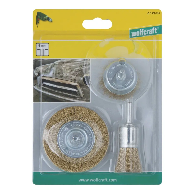 Kolmeosaline drellharjade komplekt, kuhu kuuluvad ketashari, koonushari ja pintselhari. Ketashari 75x 7mm; Koonushari läbimõõt 45mm; Pintselhari läbimõõt 25mm