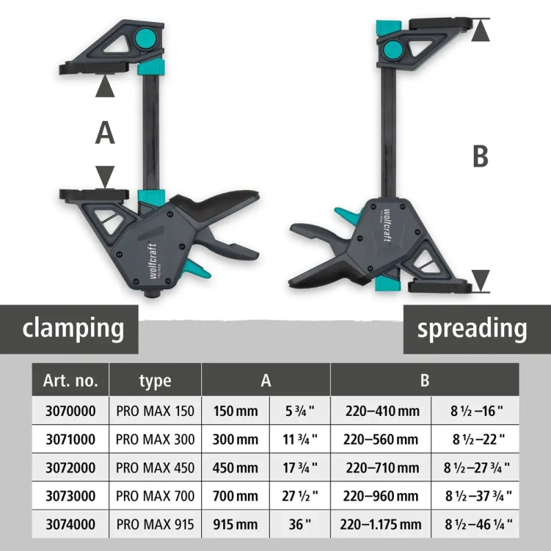PRO MAX ühekäe kiirpitstangid on wolfcrafti kõige võimsamad ühekäe kiirpitstangid. Arendatud kõrgeimate professionaalsete nõuete täitmiseks, pakuvad need tänu nutikale disainile ainulaadset töökogemust ja kindlat hoidmist. PRO MAX-i nutikas pumbamehhanism võimaldab teil kontrollida mitte ainult järjestikust pingutamist, vaid ka kiirpitstange ohutult ühe käega avada. Spetsiaalne hoova vabastusmehhanism tagab täieliku kontrolli, võimaldades pitstangide survet hõlpsalt ja turvaliselt vabastada ning pitstangide lõugu sujuvalt liigutada.