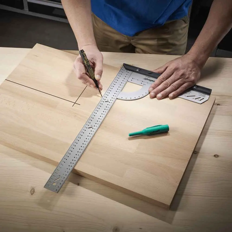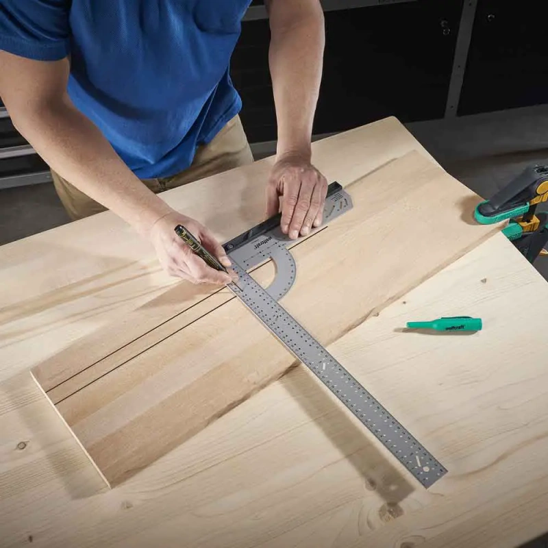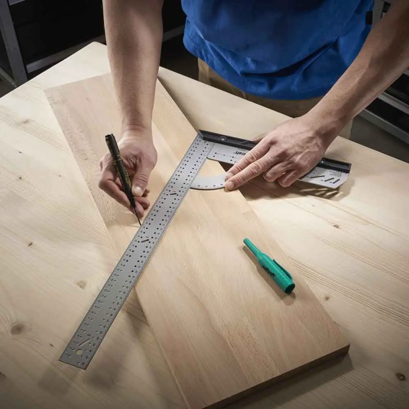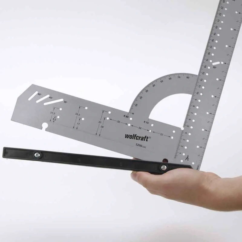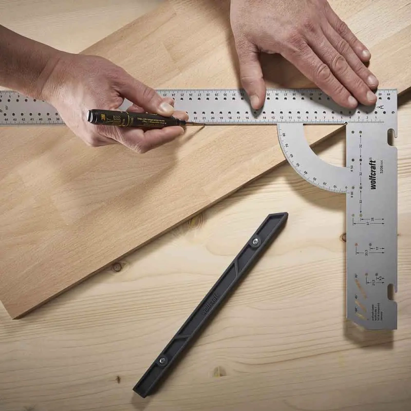 - Lame nurgik, nurgamõõteskaala, paralleelmärgistaja, märgistamismall ja varjatud hingede puurimisshabloon ühes seadmes – säästab raha ja ruumi.