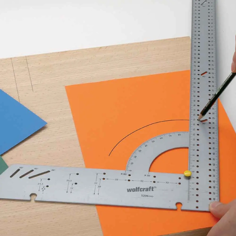Universaalne terasest mõõtmis- ja märgistusmall ühendab mitmesuguseid funktsioone ühes tööriistas. Universaalne nurgik võimaldab teil hõlpsasti määrata ja üle kanda vahemaid ning nurkade mõõte. Tugev plastikust piiraja koos aukudega juhib pliiatsit, et saaksite tõmmata paralleelseid jooni. Piiraja saab kiiresti eemaldada, et saaksite täpselt mõõta ja märgistada pindu. Kaarte ja ringide töödetailidele ülekandmiseks saab universaalset nurgikut kasutada kompassina. Nurgamõõdu skaalal olevad kaks fikseeritud raadiust võimaldavad kiiresti üle kanda kõverjooni, näiteks laudade ümarate nurkade jaoks. Nurgik toimib stabiilse juhtsiinina tikksaagi kasutamisel. See muutub kiiresti asendamatuks töövahendiks laminaadi paigaldamisel või mööbli valmistamisel. Universaalse nurgiku ja joonlauaga, millel on integreeritud 45° juhtlatt, 32-auguliin ning varjatud hingede puurimisshabloon, olete valmis igaks projektiks.