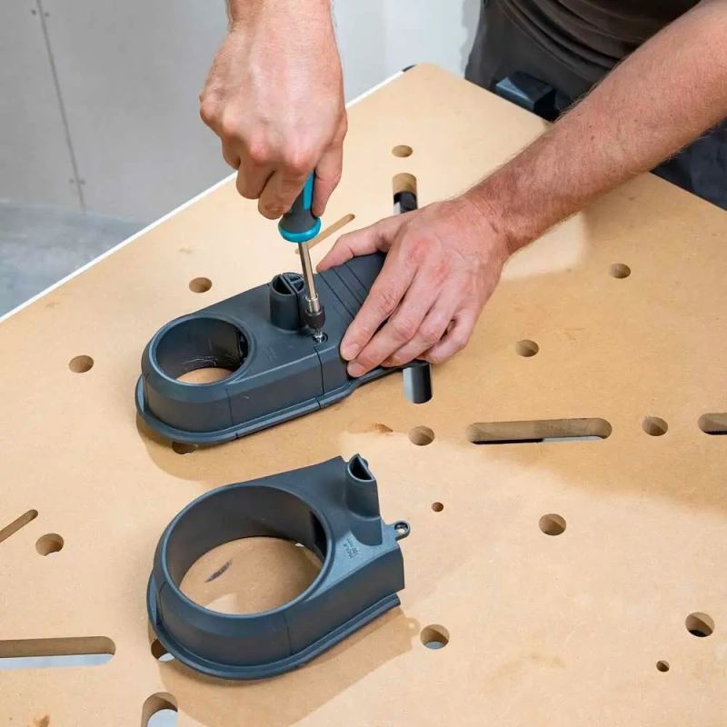 Mitmekülgseks kasutamiseks augusaagide ja augufreesidega erinevates suurustes on tolmu eemaldamise süsteemil kaks eemaldusüksust läbimõõtudega 68 mm ja 100 mm, mida saab vastavalt vajadusele vahetada. Tolmuimeja ühendus sobib kõigi tööstuslike tolmuimejatega, millel on Ø 29-32 mm voolikuühendus. Kõik osad on valmistatud kvaliteetsest klaaskiuga tugevdatud plastist (FRP). Teie usaldusväärne kvaliteettoode „Valmistatud Euroopas“.