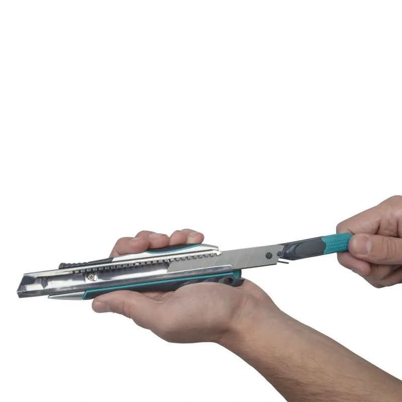 Professionaalne kahe seadistusvõimalusega murtav tera nuga pakub kahte lõikamisrežiimi, mis sobivad nii ohutuks koduseks kasutamiseks kui ka meisterdamiseks. Ohutusfunktsioon tõmbab tera automaatselt tagasi kesta sisse kohe, kui liugur vabastatakse. Teralukk aktiveerub, kui autolukk on sisse lülitatud, võimaldades valida iga töö jaoks optimaalse seade. Nii on sul üks tööriist paljude erinevate kasutusvõimaluste jaoks. Vastupidav metallkorpus ja ergonoomiline pehme haardeala teevad lõikamise mugavaks. Tera juht on samuti metallist, andes noale tugevuse ja vastupidavuse. Terade vahetus on lihtne ja tööriistavaba, kasutades kõiki tavalisi 18 mm murtavaid terasid.