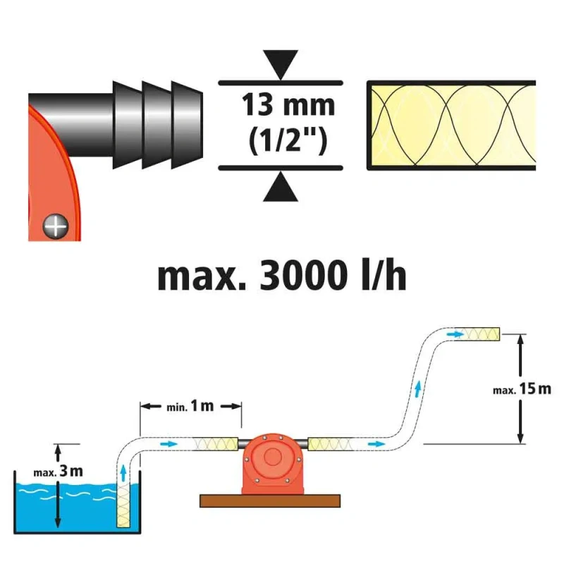 Lihtsalt kinnitage 2 aiavoolikut 13 mm läbimõõduga voolikuühenduste külge. Käivitage pump madalal pöörlemiskiirusel, seejärel suurendage kiirust maksimaalse pöörlemiskiiruseni. 2800 pööret minutis.